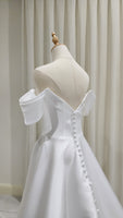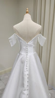 Vienna is effortlessly elegant yet undeniably beautiful. What makes her so perfect is the balance between her lightweight feel and her bold, structural design. With dramatic oversized off-shoulder straps, a row of classic satin buttons flowing to the hemline, a distinctive diamond-shaped back and a playful front split, Vienna captures a charm all her own. She’s the perfect example of a modern-class gown.